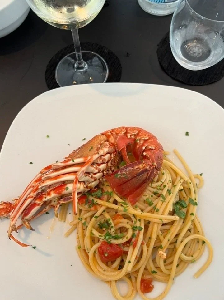 If you find yourself in Sapri, then you must dine at Tintobrace, across the street from the sea walk. It has clean modern décor mixed with dark wood and lots of well-placed glass and ceramics that give a high-end yet nautical vibe. Saying our meal was “spectacular” is an understatement. We had a variety of delicious, elegantly served seafood dishes paired with fantastic bottle of vermentino di Sardegna (a nod to Isidoro’s birthplace). We were ready to return before we left! The service was friendly, easy, and unhurried. It was such an unexpected surprise - - it made our day. We had recently been to Lo Scoglio to conduct a “post-Stanley Tucci fame” check-in and were disappointed with mediocre food, sloppy service, and the highest bill we ever paid for food in Italy. After our winning lunch at Tintobrace, we were ready to give Stanley a call to make a recommendation for his new show.